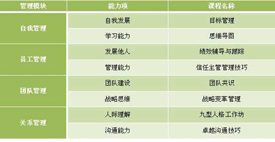 管理類課程體系和軟性技能相關(guān),主要包括自我管理、員工管理、團(tuán)隊(duì)管理和關(guān)系管理四大模塊。