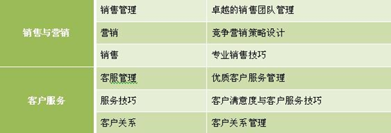 公司各個組織單元下的職能可以進(jìn)行進(jìn)一步的細(xì)分,根據(jù)細(xì)分的職能就可以確定專業(yè)方向上的培訓(xùn)課程體系。人力資源單元可以分為人力資源管理、招聘、員工發(fā)展、績效、薪酬、員工關(guān)系;行政單元可以分為行政管理、秘書;財務(wù)單元可以分為財務(wù)管理、會計、審計;物流與供應(yīng)單元可以分為采購、物流、倉儲;生產(chǎn)與質(zhì)量管理單元可以分為生產(chǎn)管理、現(xiàn)場管理、流程管理、質(zhì)量管理、過程管理;銷售與營銷單元可以分為銷售團(tuán)隊(duì)管理、營銷、銷售、市場;客戶服務(wù)單元可以分為客服管理系統(tǒng)、客戶服務(wù)、客戶關(guān)系。以下為專業(yè)類課程體系部分部分內(nèi)容: