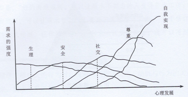 核心觀點四:五個層次的需求常常同時存在,只是需求的強度呈現(xiàn)如圖4-3所示的拋物線狀分布。